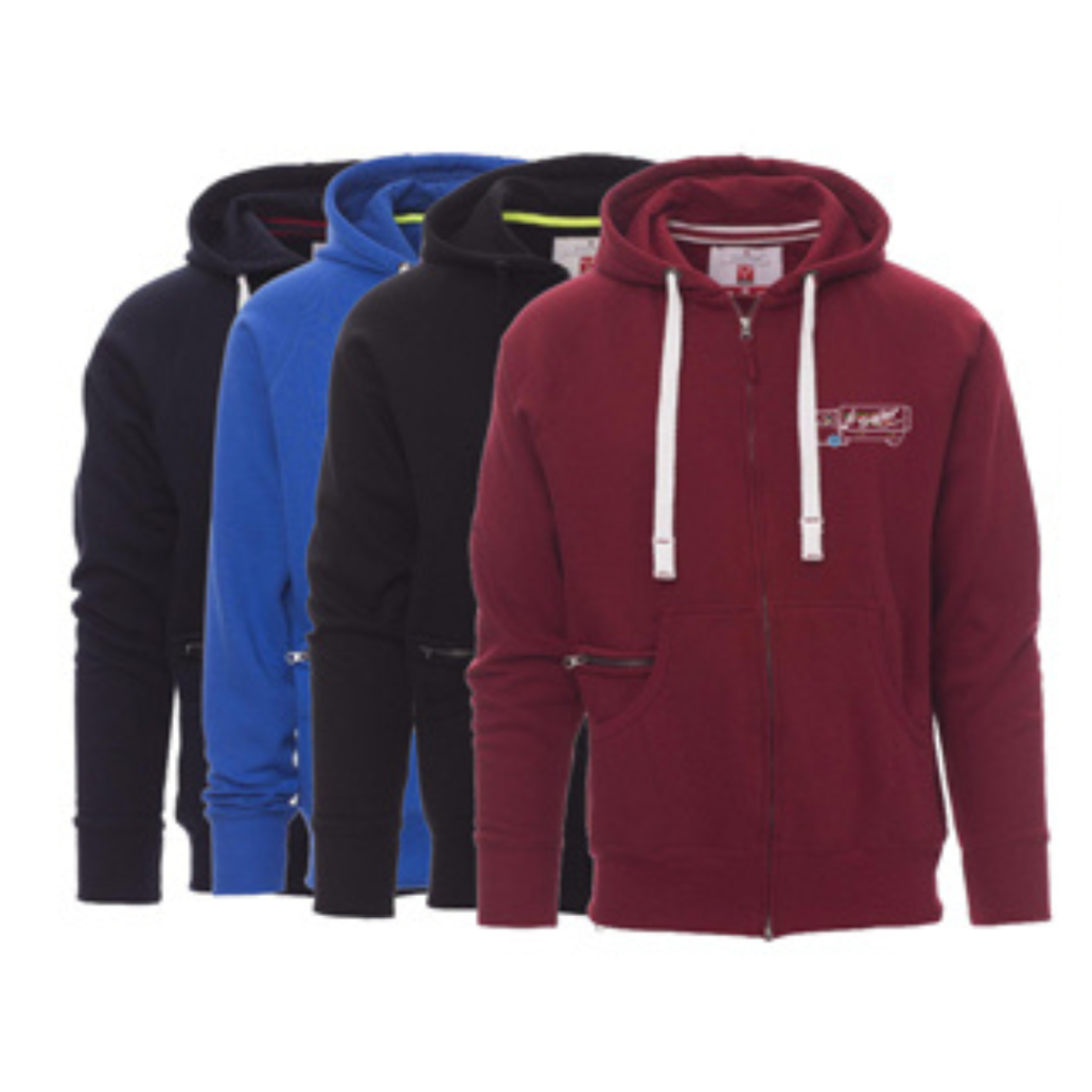 Felpa da uomo, zip intera SBS coperta in plastica con doppio cursore in metallo, cappuccio con due cuciture, coulisse bianca in corda con cuciture in tinta con la felpa e anelli in metallo, manica raglan, tasche a marsupio con taschino con zip, polsini e vita in costina elasticizzata. Cuciture rinforzate.